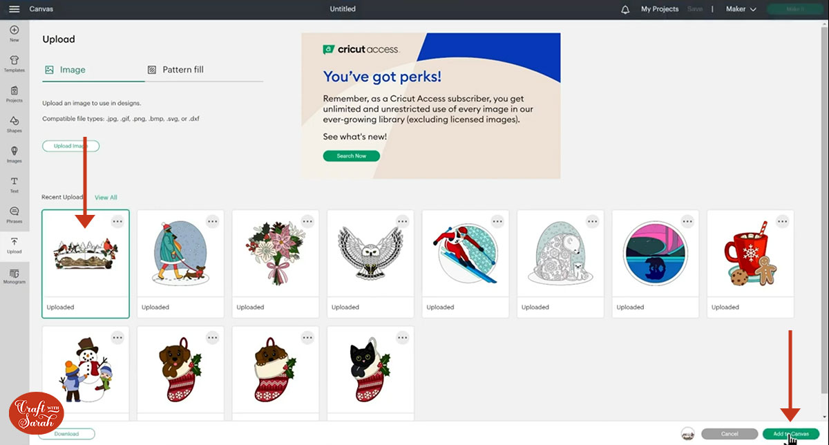 After uploading, the design will show in your “Recently Uploaded Images”. Click on it and then press “Add to Canvas” to put it onto your Project.