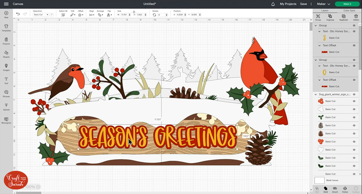 The photos I’ve included of my finished sign have the phrase “Season’s Greetings” on it, but that isn’t included as part of the SVG.