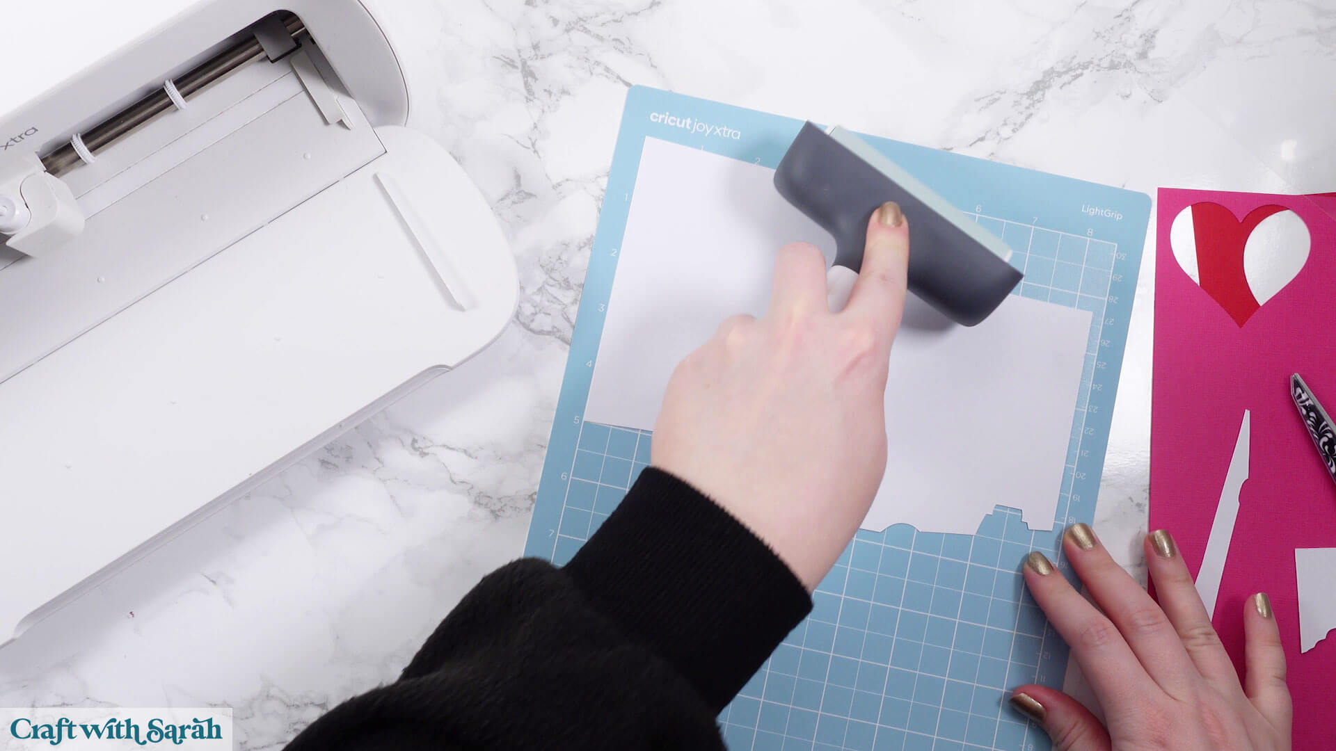 Use your brayer or scraper to press the cardstock down firmly on the cutting mat. If you don’t have one, press firmly all over the cardstock with your hands.