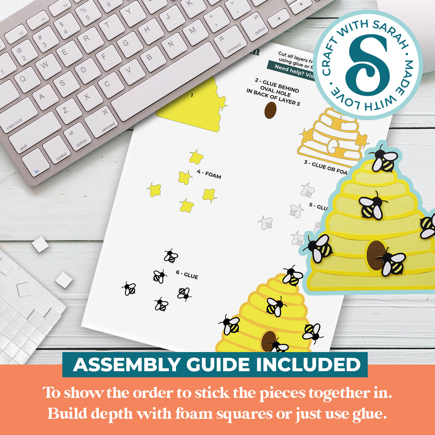 Printable PDF versions are included for hand-cutting, with each layer/piece shown separately on the pages. A black and white version and a full-color version of the hand-cutting templates are included.
