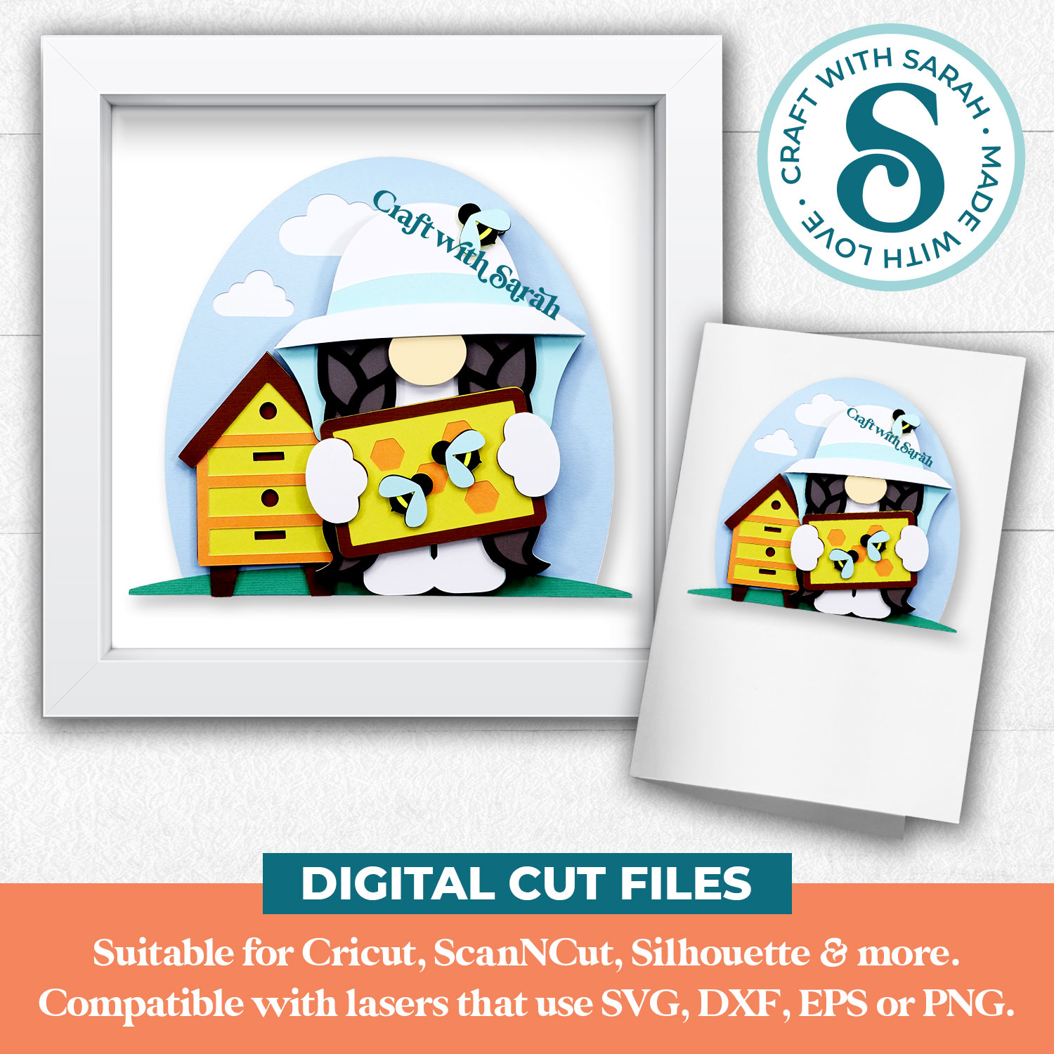 A layered cutting file of a female beekeeper gnome.