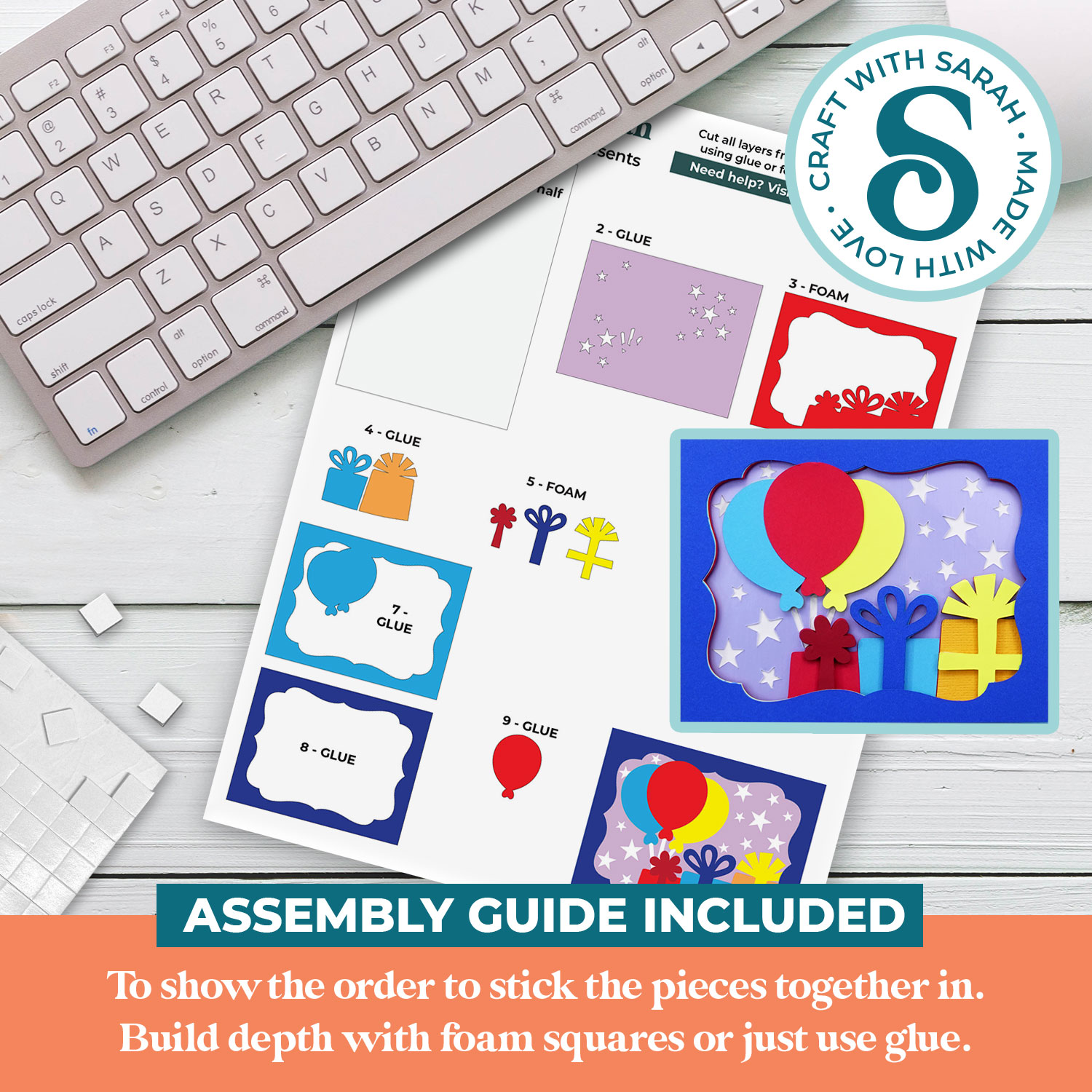 This greetings card comes with an assembly guide that shows the order to stick the pieces together in.