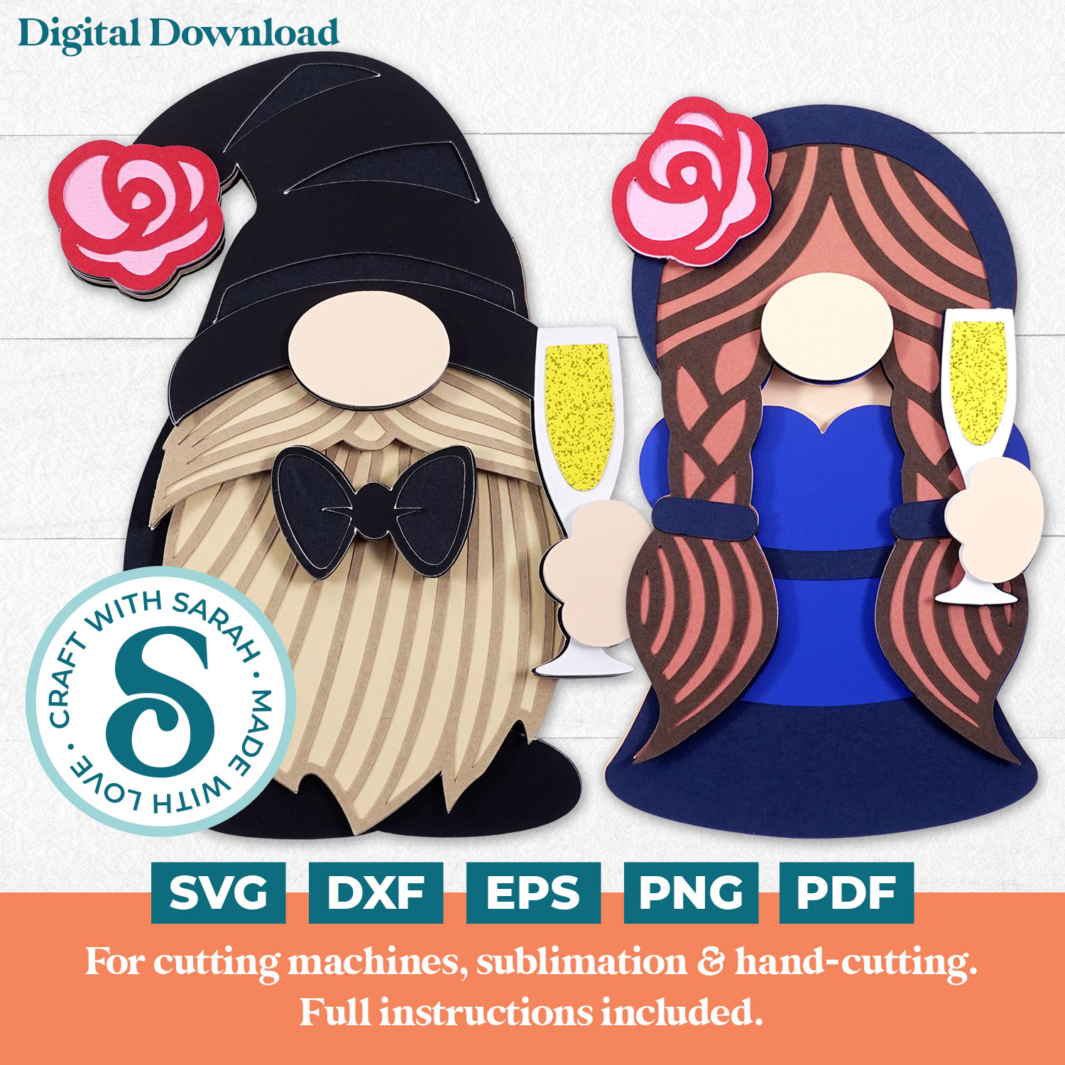 A matching male and female pair of gnome cutting files wearing fancy outfits for a black tie party.