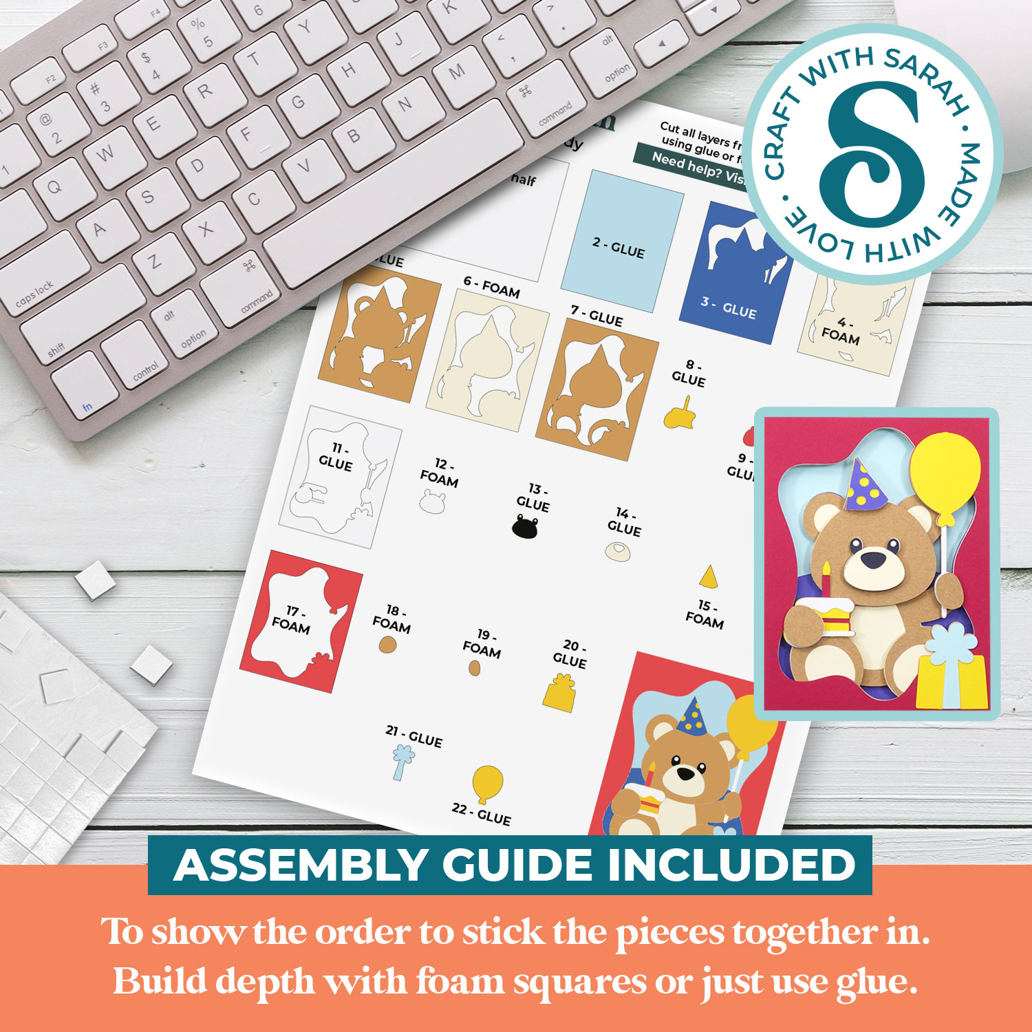 This greetings card comes with an assembly guide that shows the order to stick the pieces together in.