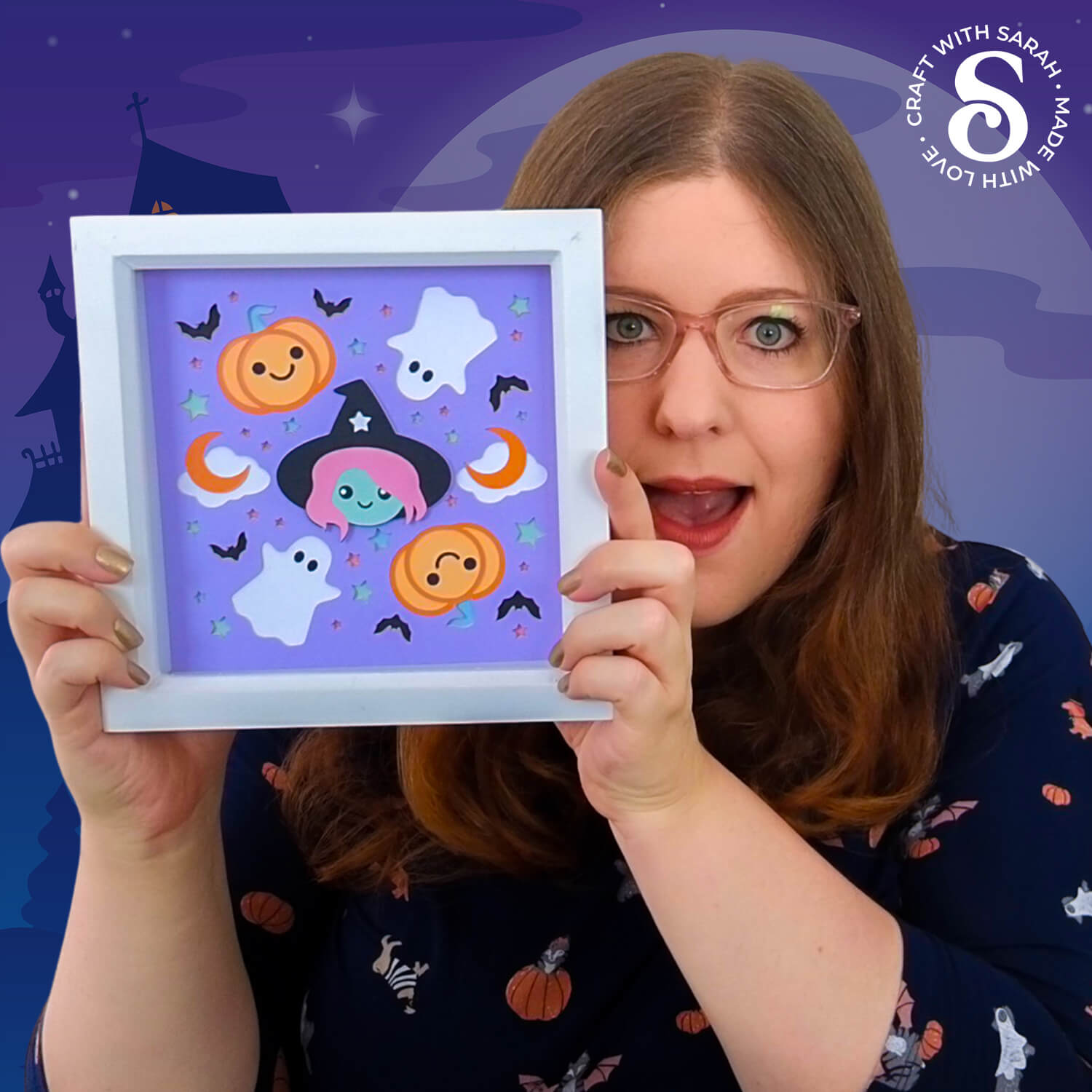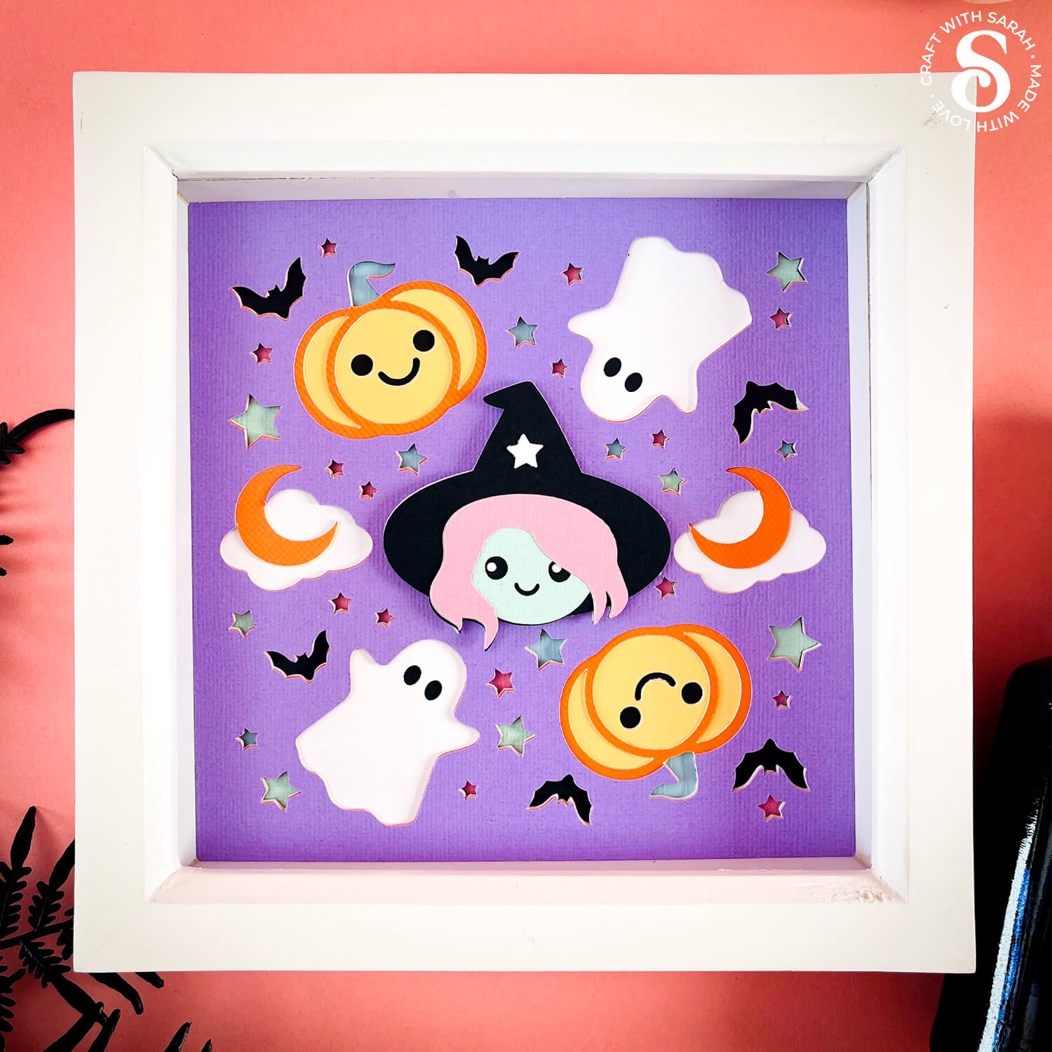 A layered cutting file for a build down shadow box with a Kawaii Halloween theme.