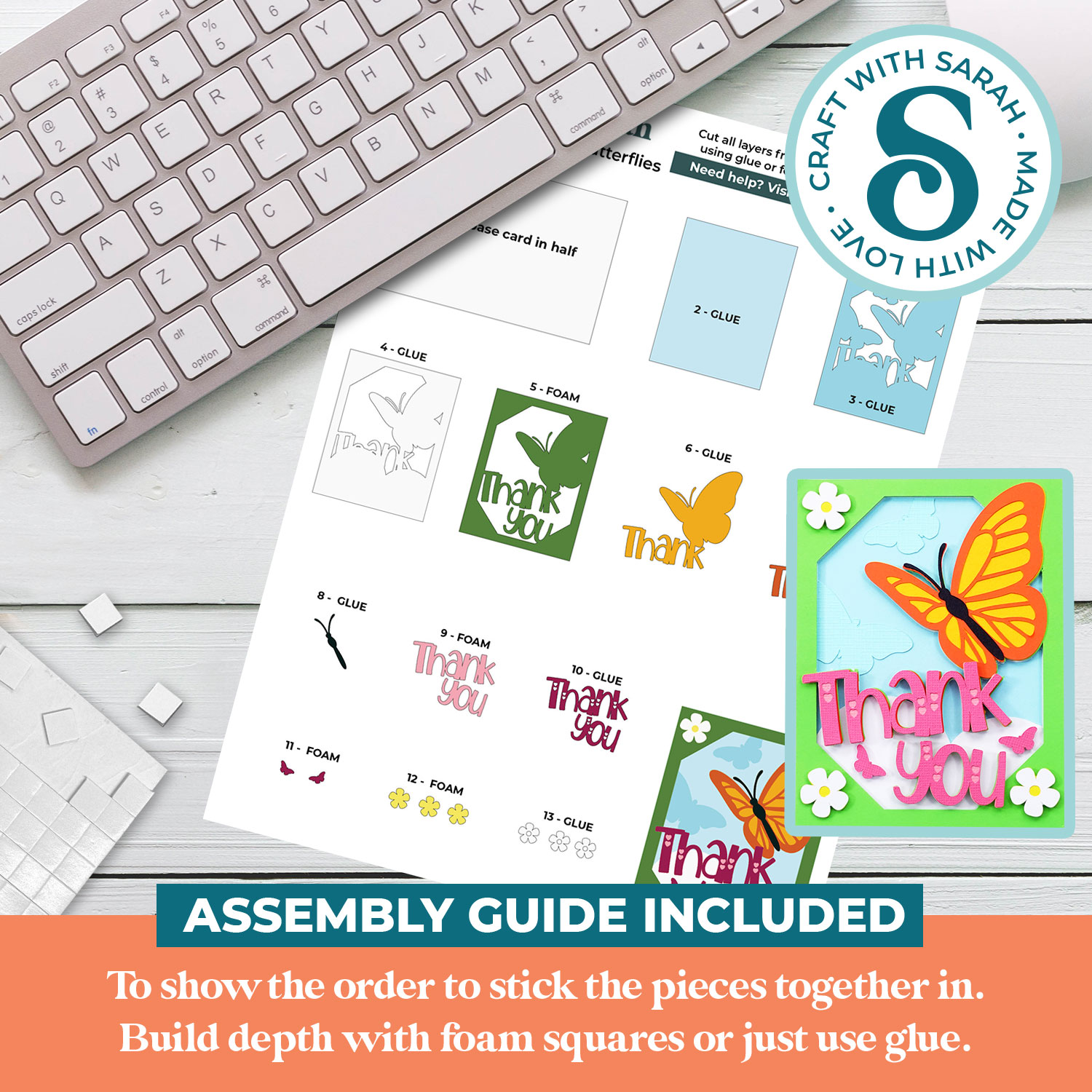 This greetings card comes with an assembly guide that shows the order to stick the pieces together in.