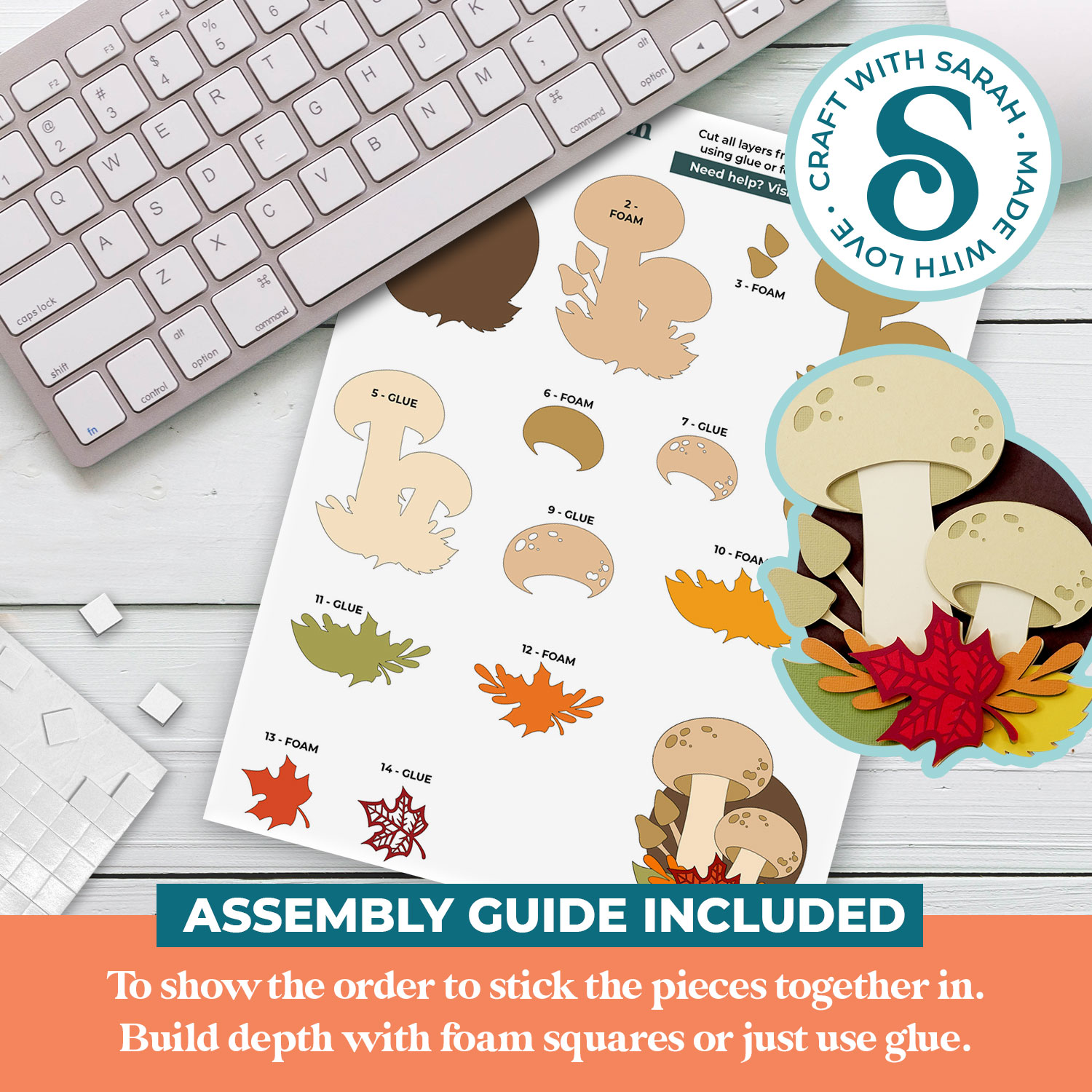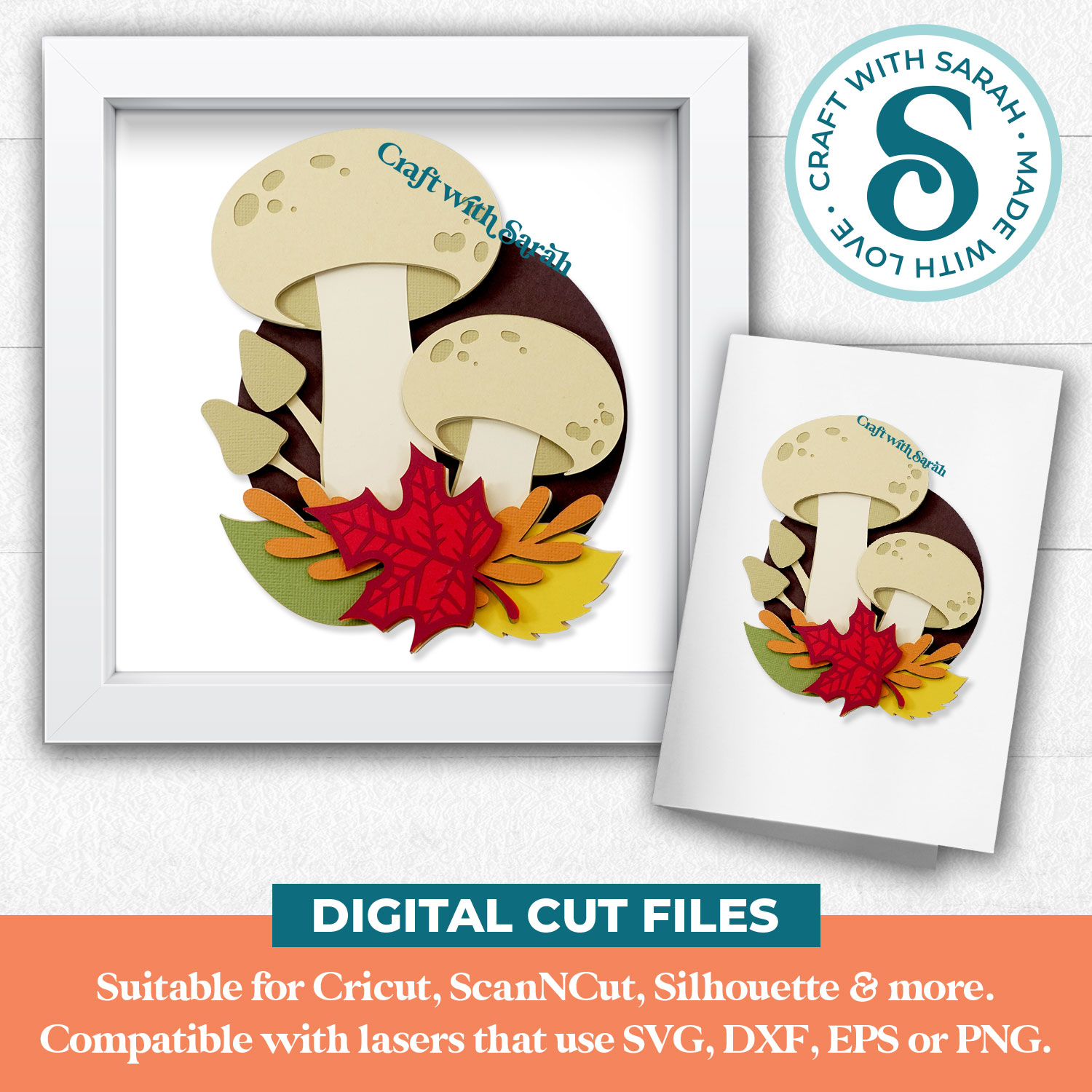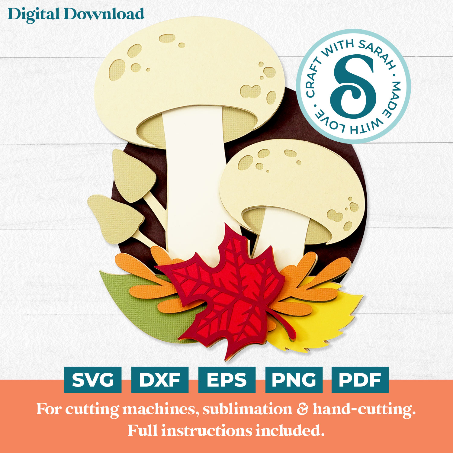 A layered cutting file showing button mushrooms growing from the forest floor, with autumn leaves and foliage all around.