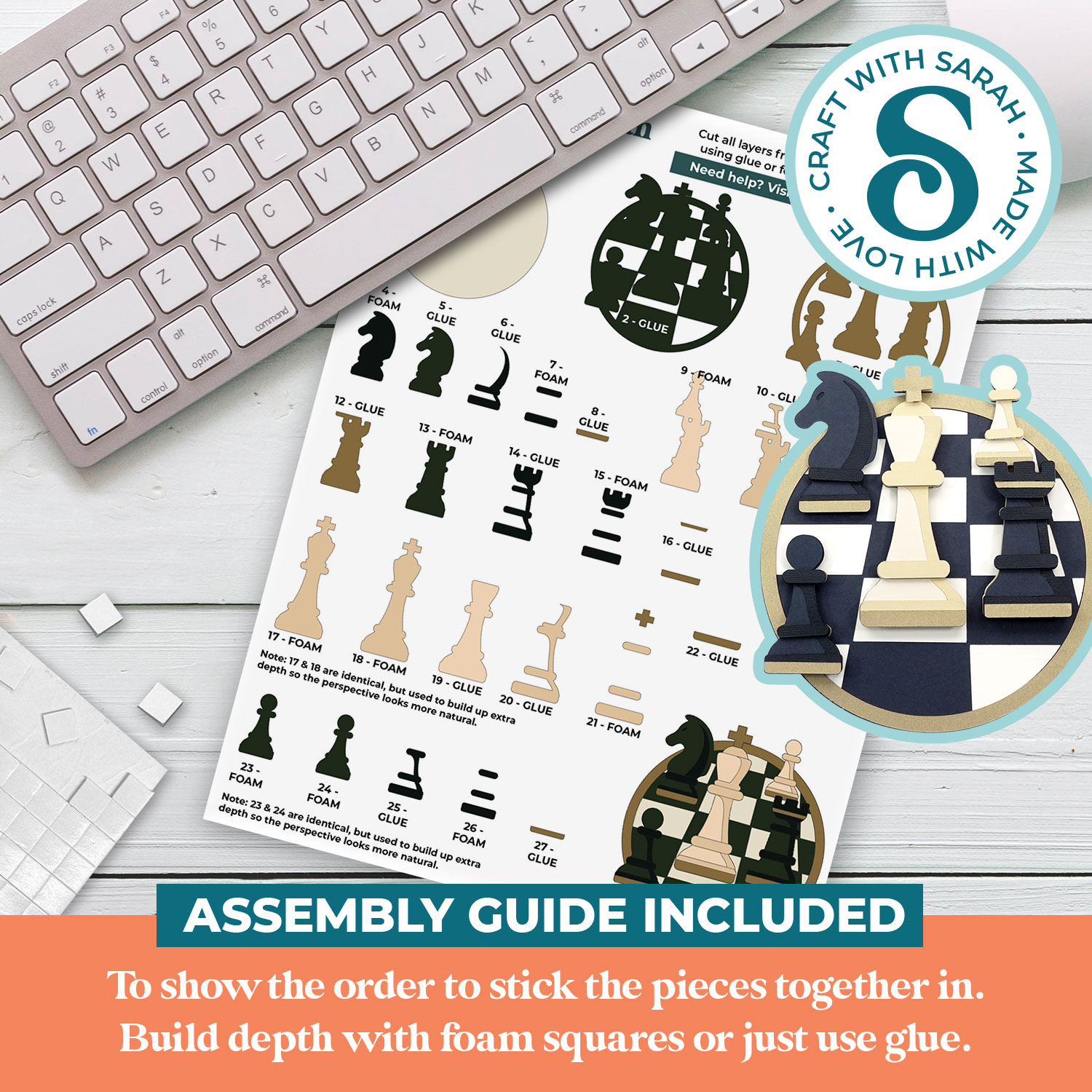 An assembly guide is included that shows the order to stick the pieces together in.