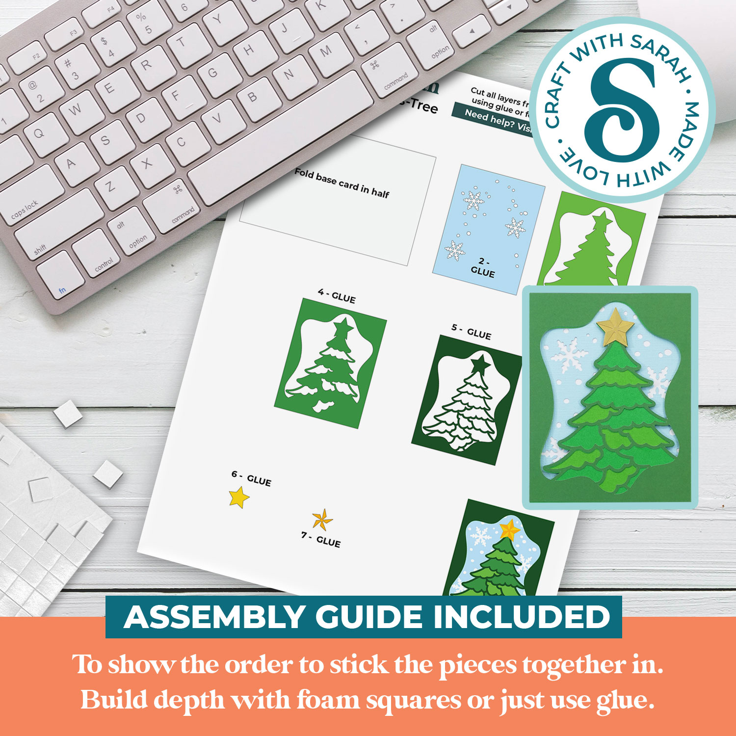 This greetings card comes with an assembly guide that shows the order to stick the pieces together in.