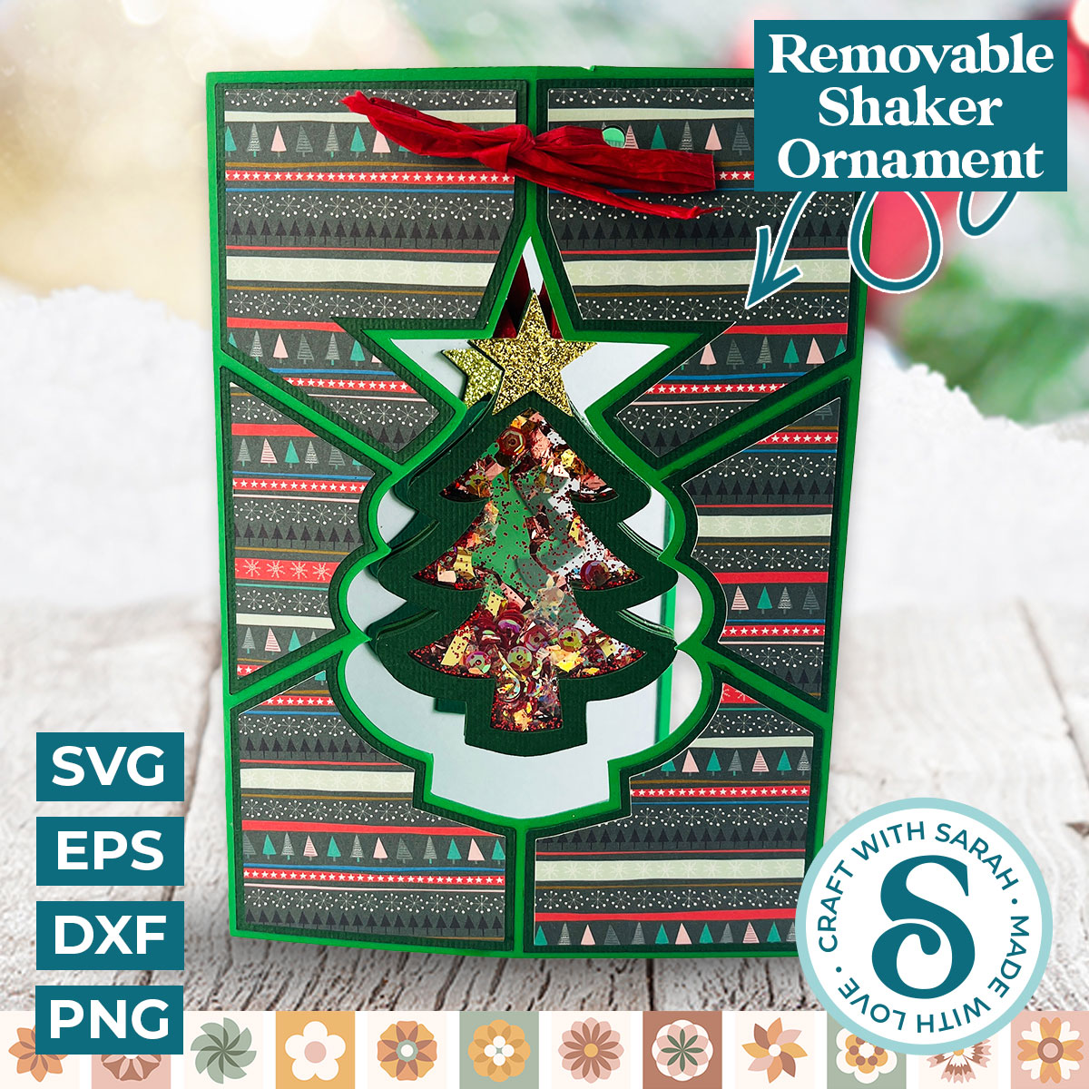 A Christmas tree card with removable shaker ornament on the front.