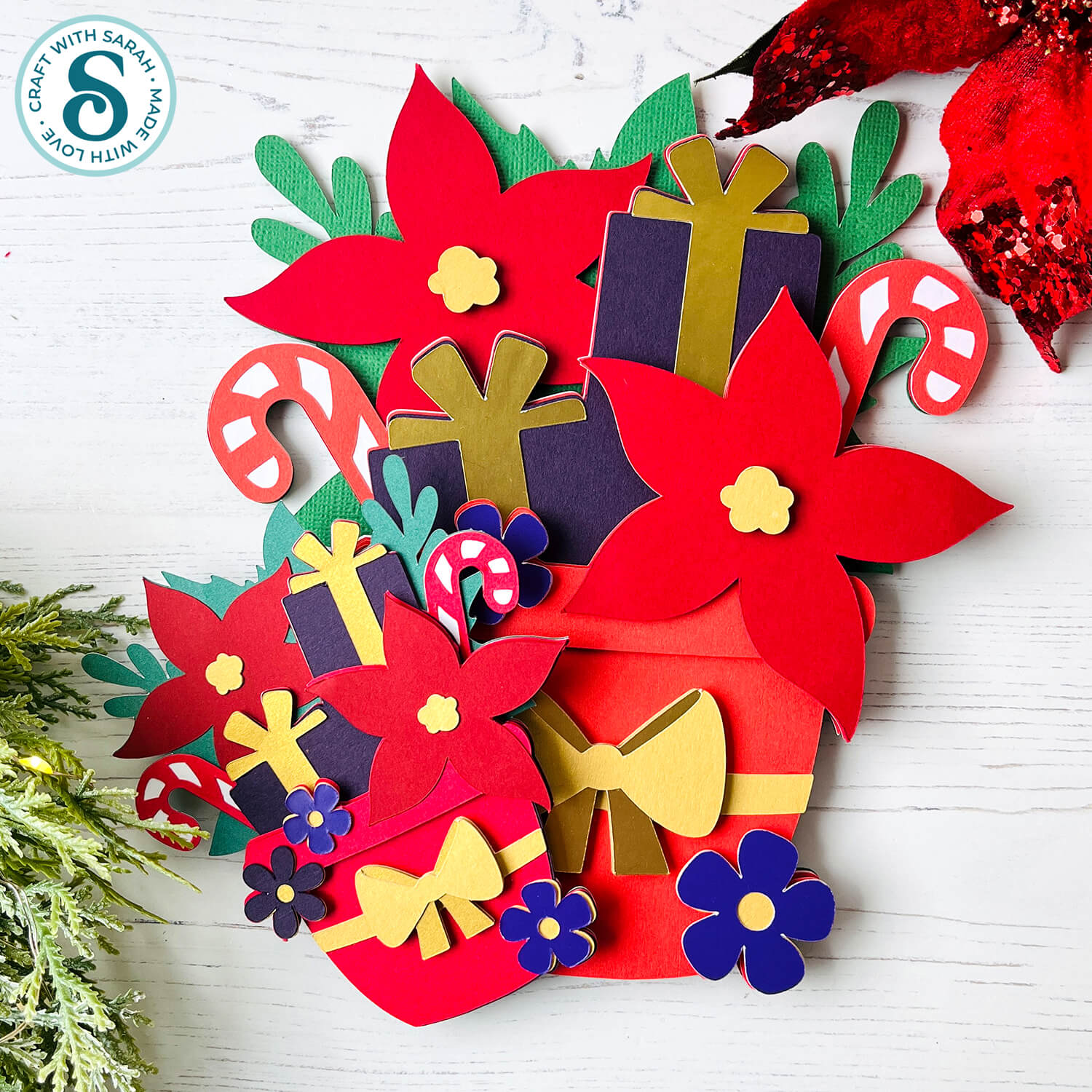 This layered Christmas flowers SVG features two red poinsettias emerging from a flower pot, with greenery in the background, two wrapped Christmas presents and a big ribbon on the front of of the flower pot.