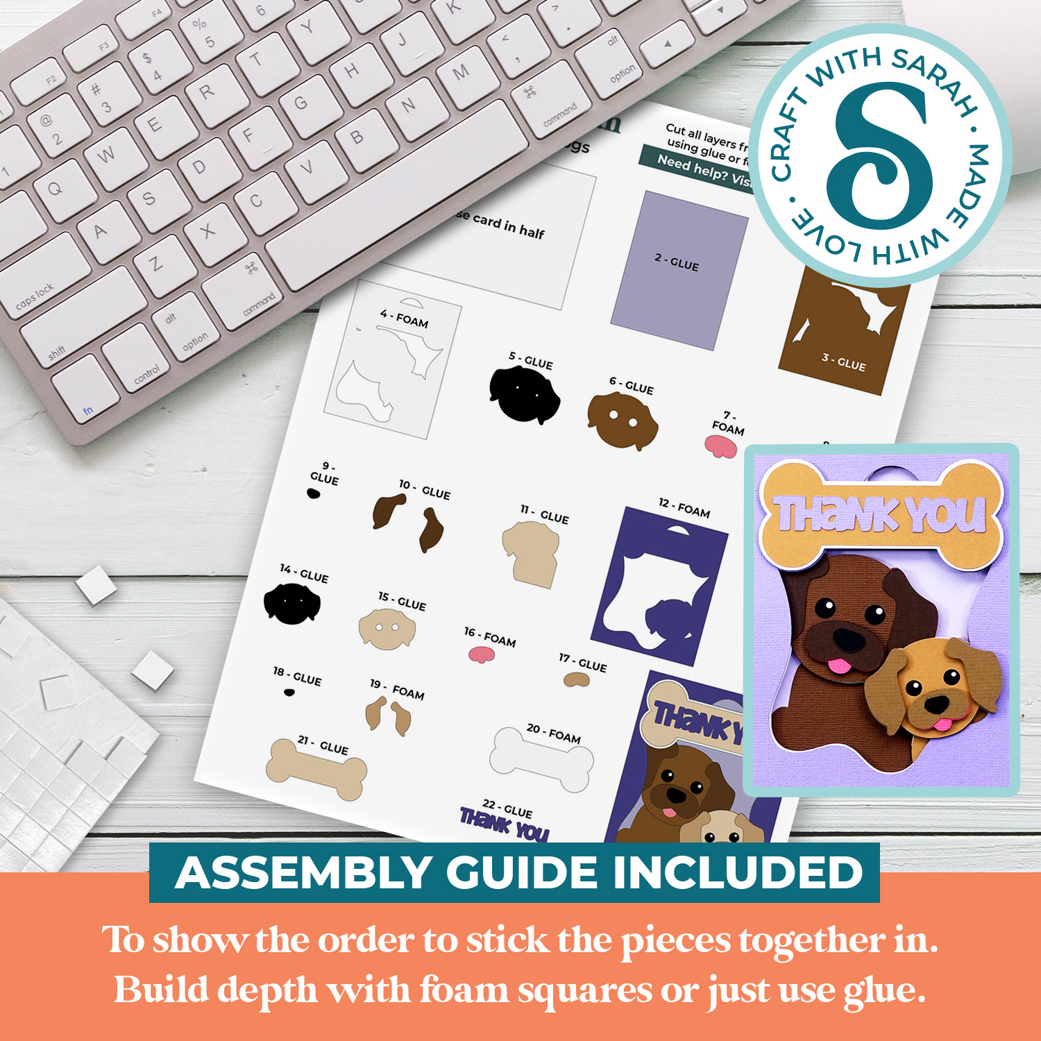 This greetings card comes with an assembly guide that shows the order to stick the pieces together in.