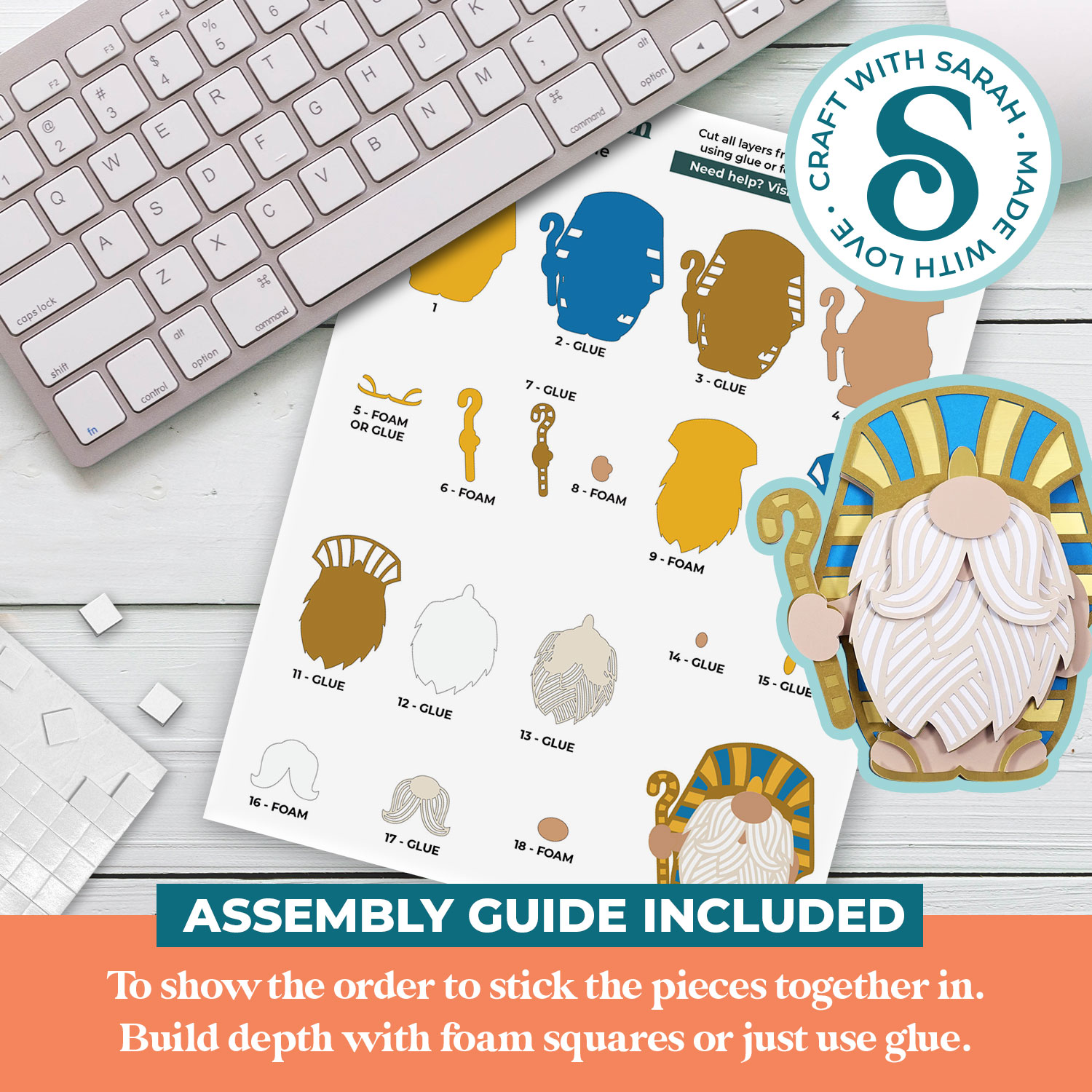 An assembly guide is included that shows the order to stick the pieces together in.