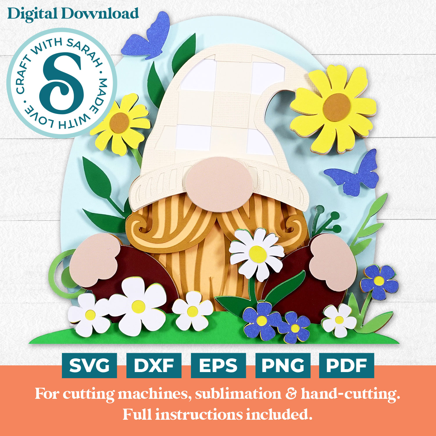 A layered cutting file of a male gnome sitting in a field of flowers, with butterflies fluttering around him.