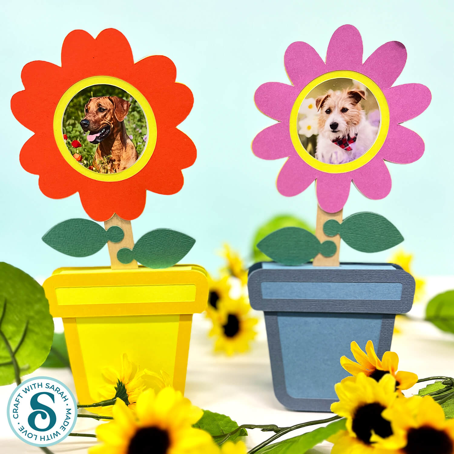 Bright, colourful papercraft flowers with your favourite photos nestled inside are the perfect way to brighten up your desk or shelves.