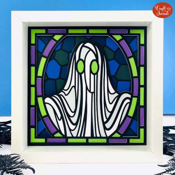 This stained glass SVG uses multiple layers of cardstock to create a stained glass effect. The finished layered design looks great in a shadow box frame for Halloween.