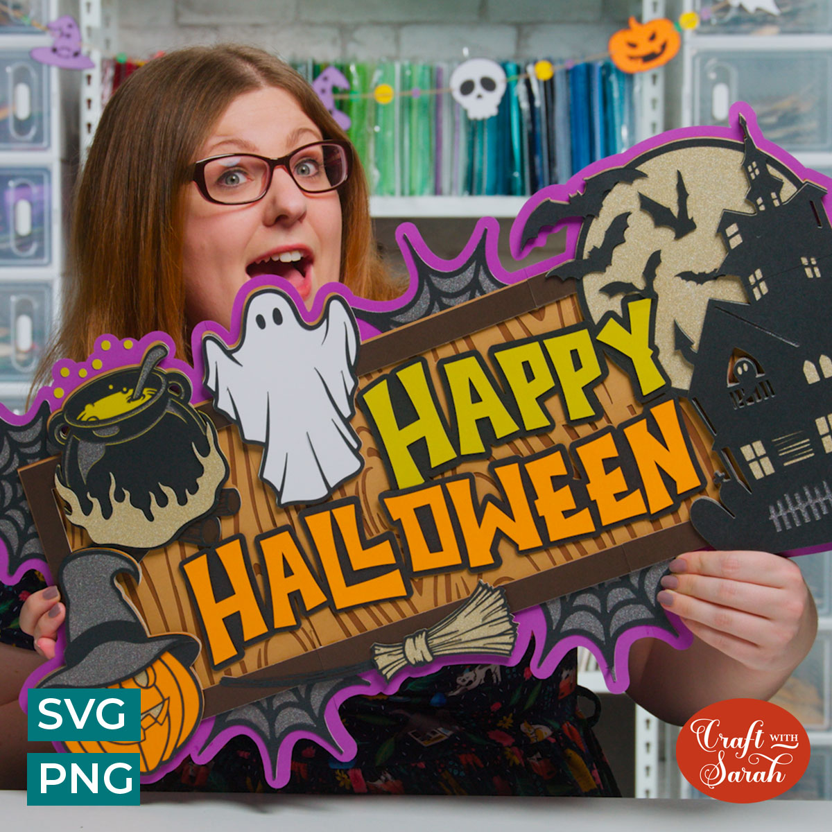 This massive “Happy Halloween” sign measures a whopping 28.5 inches wide, but it can be cut on a normal Cricut mat from 12×12, US letter or A4 paper.