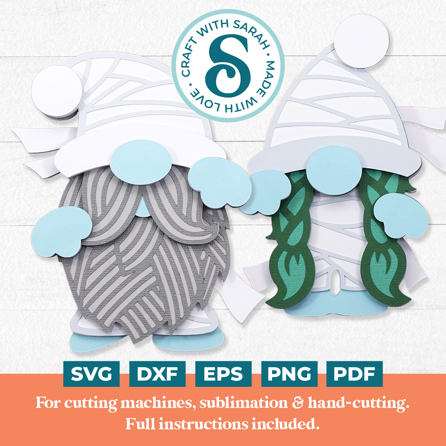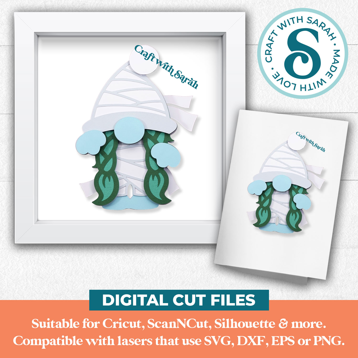 A pair of layered SVGs showing male and female Halloween gnomes, each dressed as an Egyptian mummy with bandages.