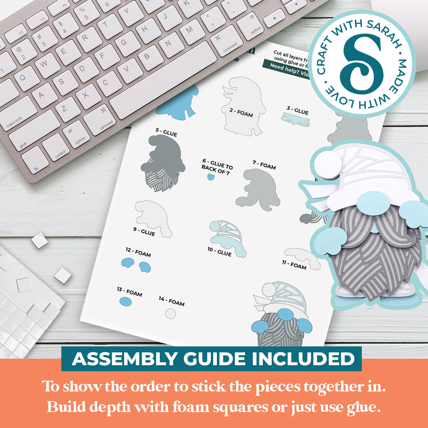 Printable PDF versions are included for hand-cutting, with each layer/piece shown separately on the pages. A black and white version and a full-color version of the hand-cutting templates are included.