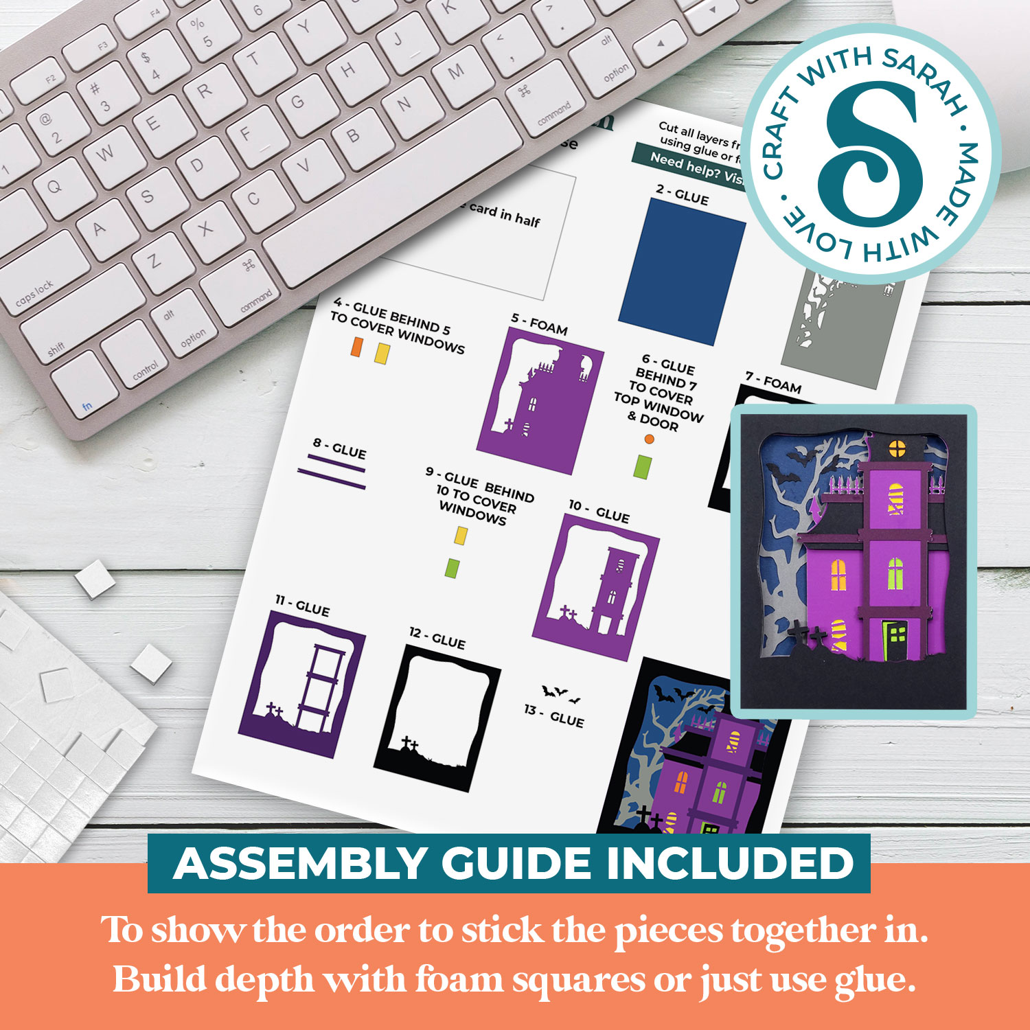 A layered cutting file to make an A2 card with a Halloween haunted house theme.
