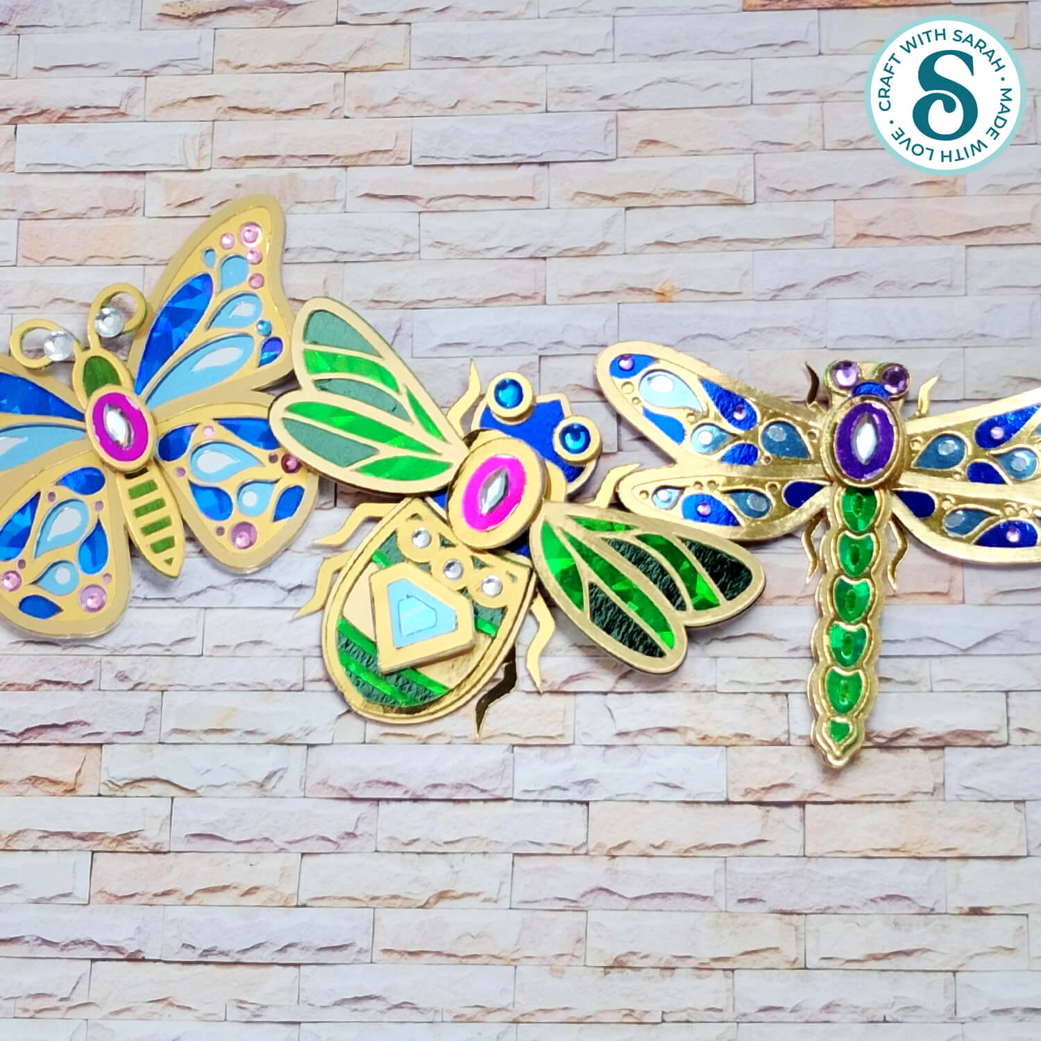 A butterfly, bee and dragonfly design are included.