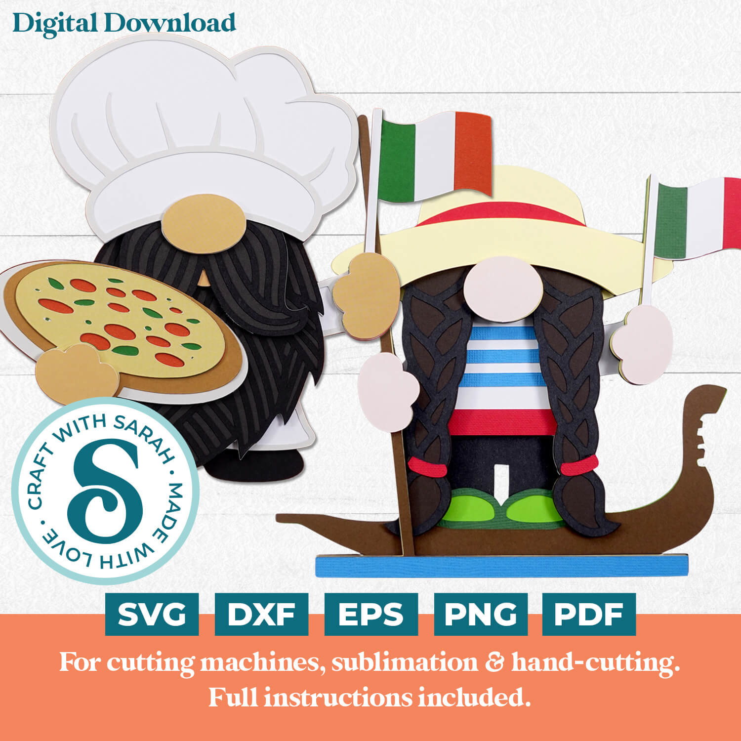 Printable PDF versions are included for hand-cutting, with each layer/piece shown separately on the pages. A black and white version and a full-color version of the hand-cutting templates are included.