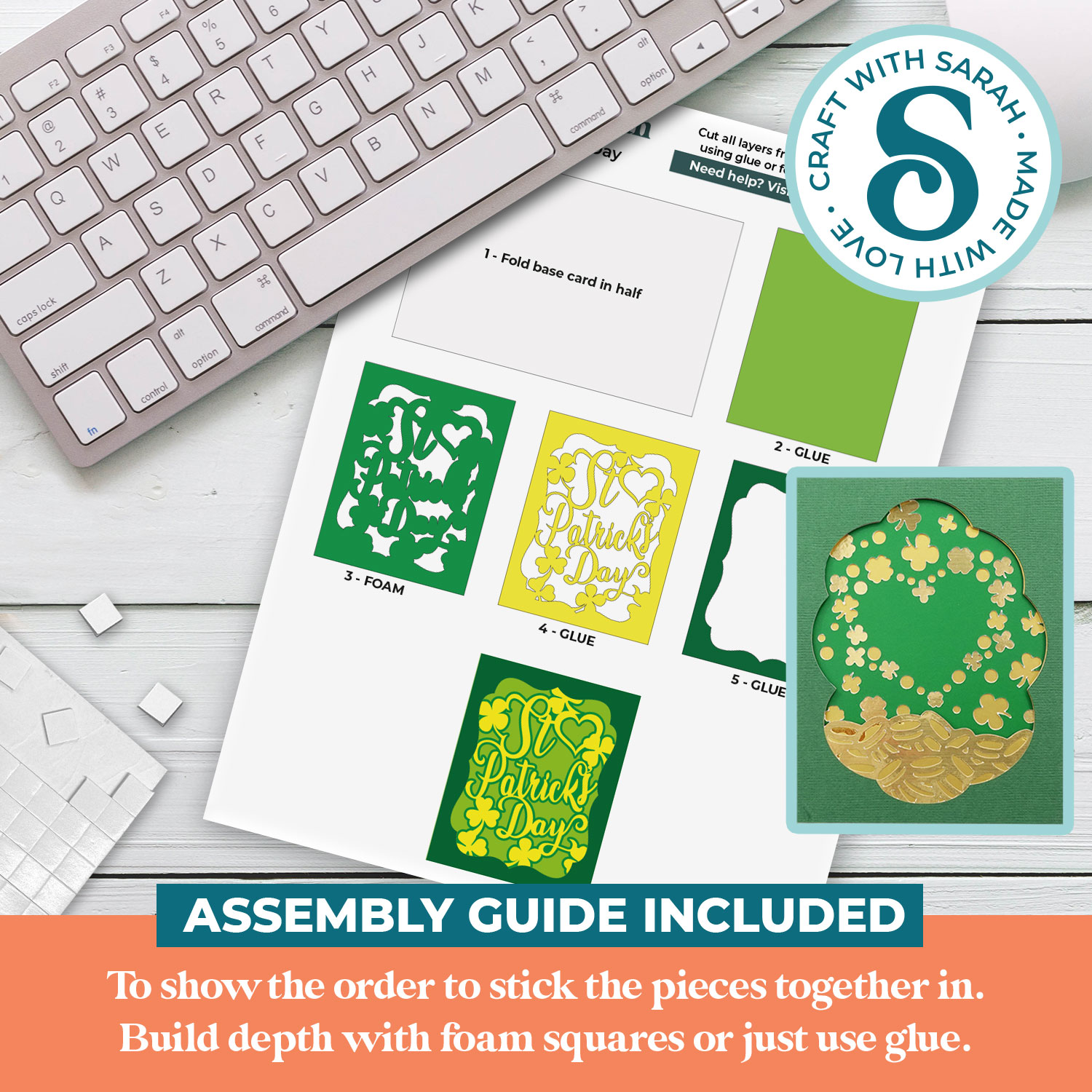 This greetings card comes with an assembly guide that shows the order to stick the pieces together in.