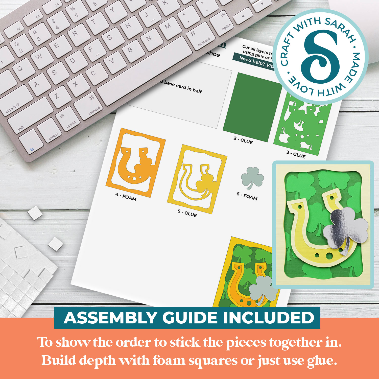 A layered cutting file to make an A2 card showing a lucky horseshoe design, with a background of shamrocks and a large shamrock on top of the horse shoe.