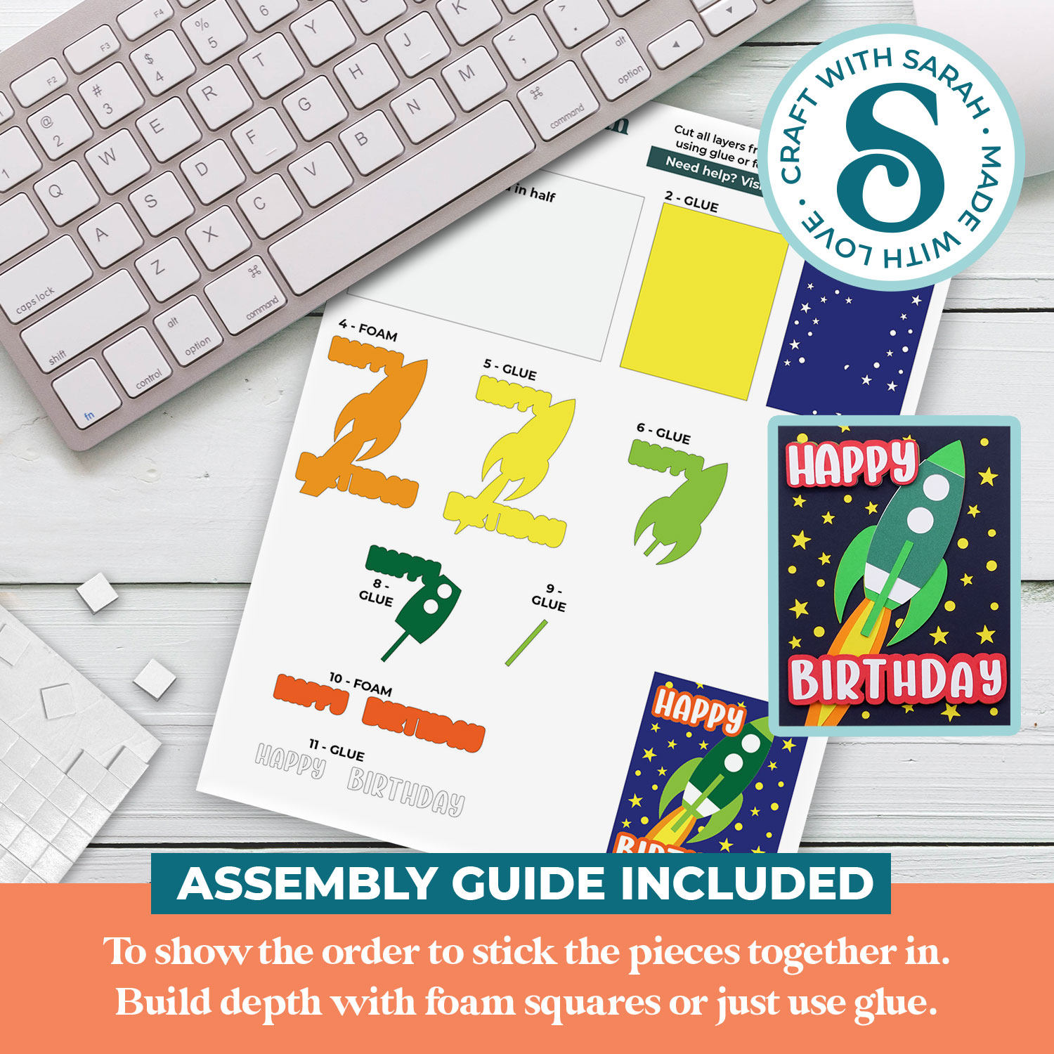 This greetings card comes with an assembly guide that shows the order to stick the pieces together in.