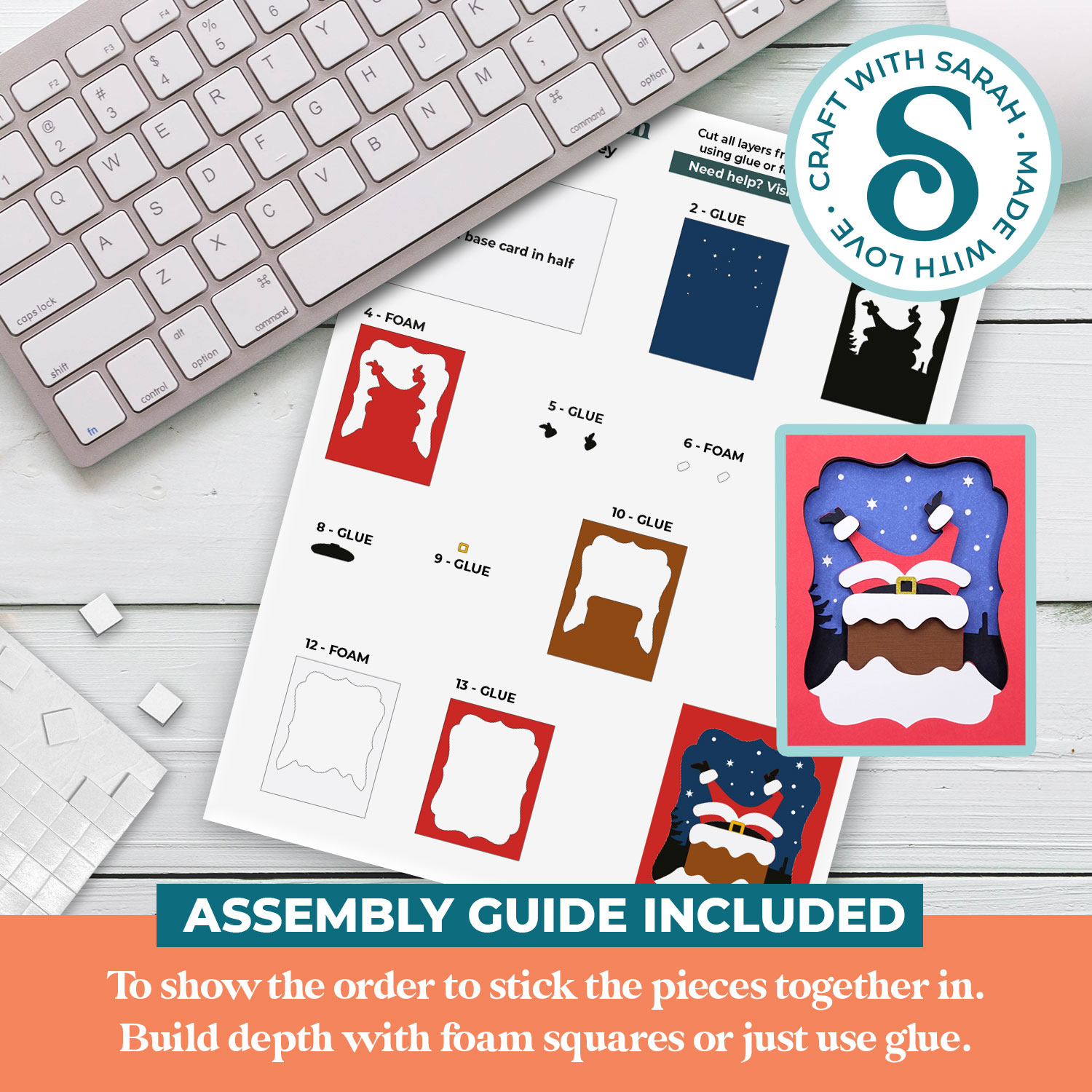 This greetings card comes with an assembly guide that shows the order to stick the pieces together in.
