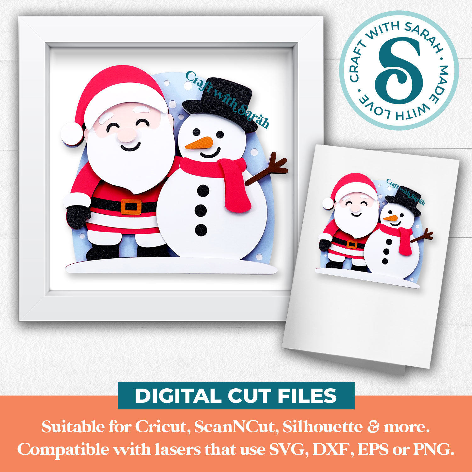 A layered cutting file of Santa Claus with his arm around his snowman friend.