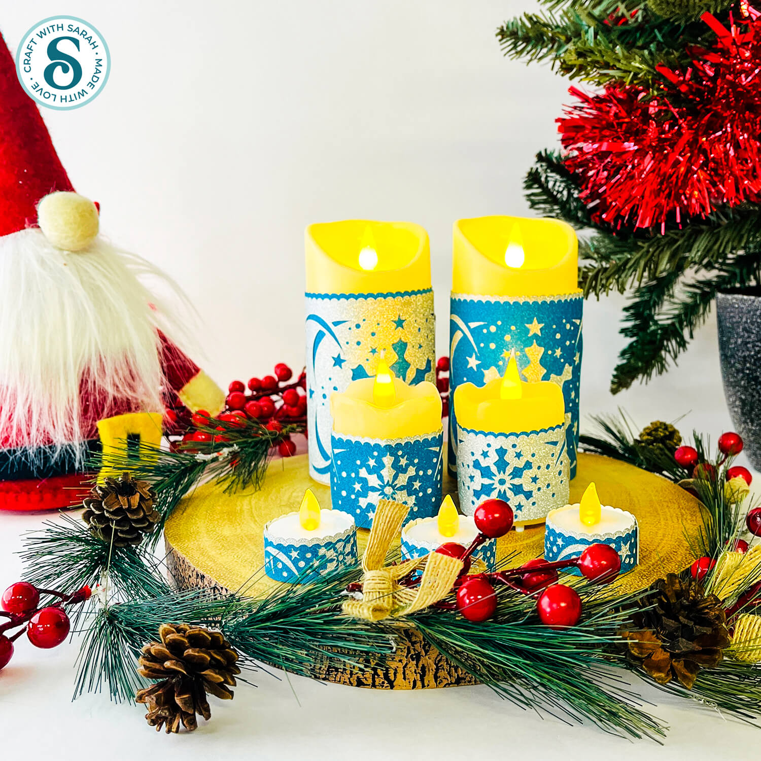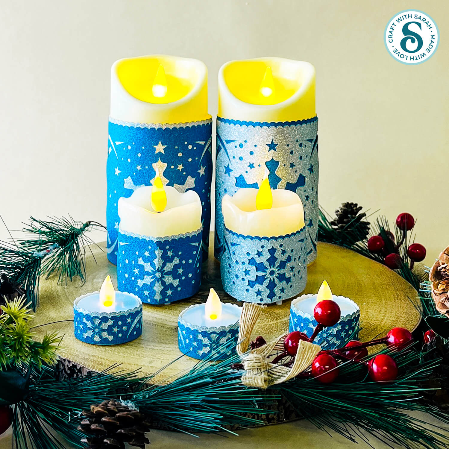 These candle wrap designs feature intricate snowflake cutouts that are pulled neatly around battery operated candles, turning simple tealights or pillar candles into elegant, impressive displays.