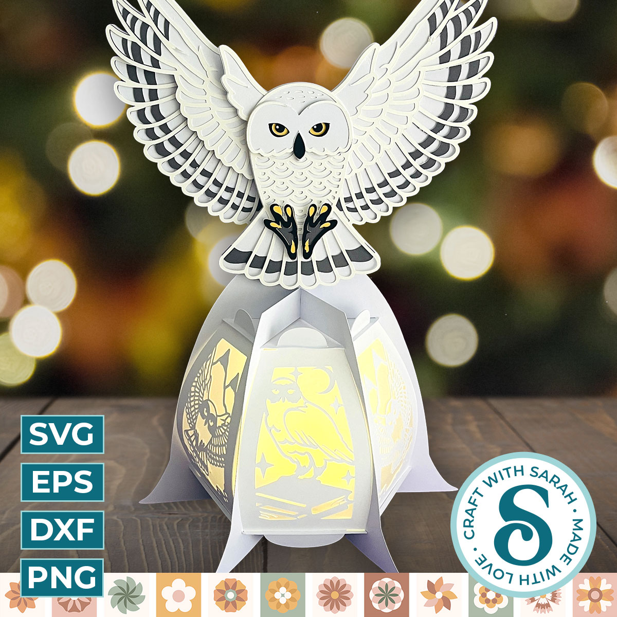 A 3D base lantern with a detailed snowy owl on top with wings outstretched and owl themed scenes in the side panels.