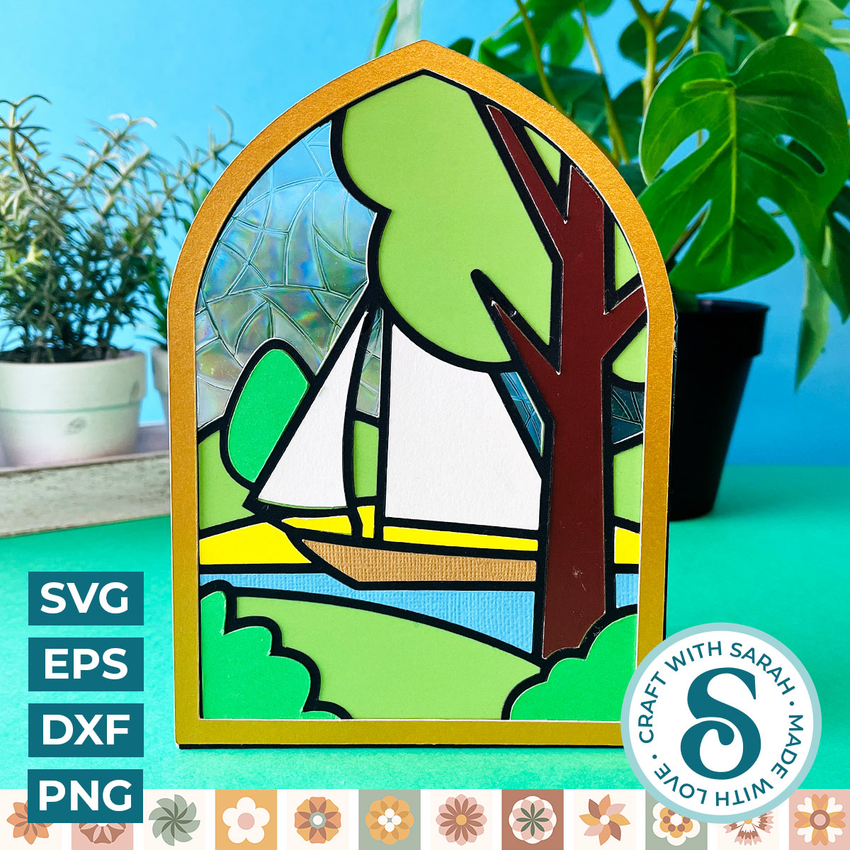 This pretty summer glass window project shows a tree, lake and mountains in the sunshine, with a boat sailing down the lake.