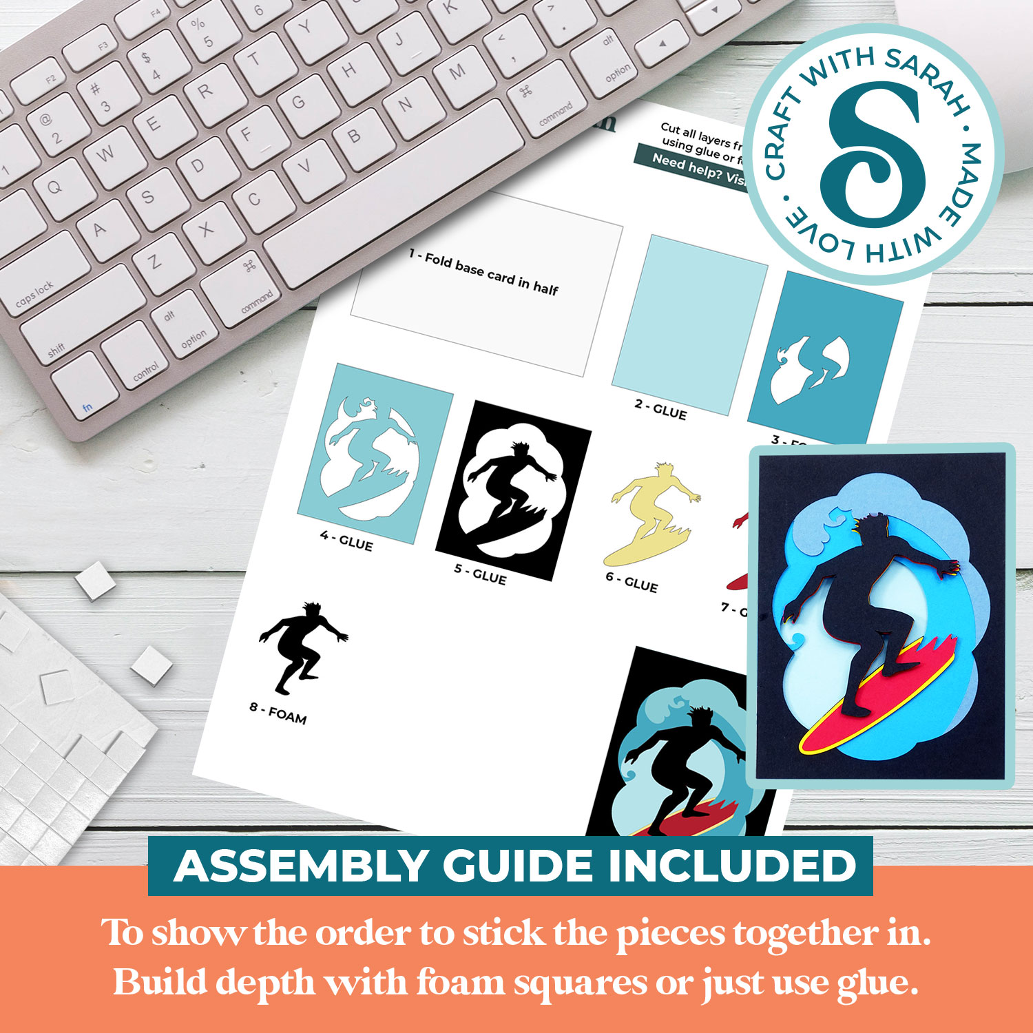 This greetings card comes with an assembly guide that shows the order to stick the pieces together in.