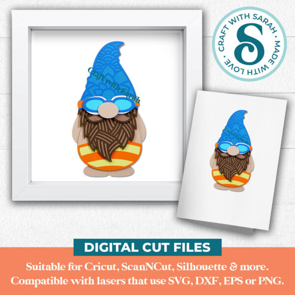 This gnome SVG shows a male gnome dressed for the poolside with their swimming costume and goggles on.