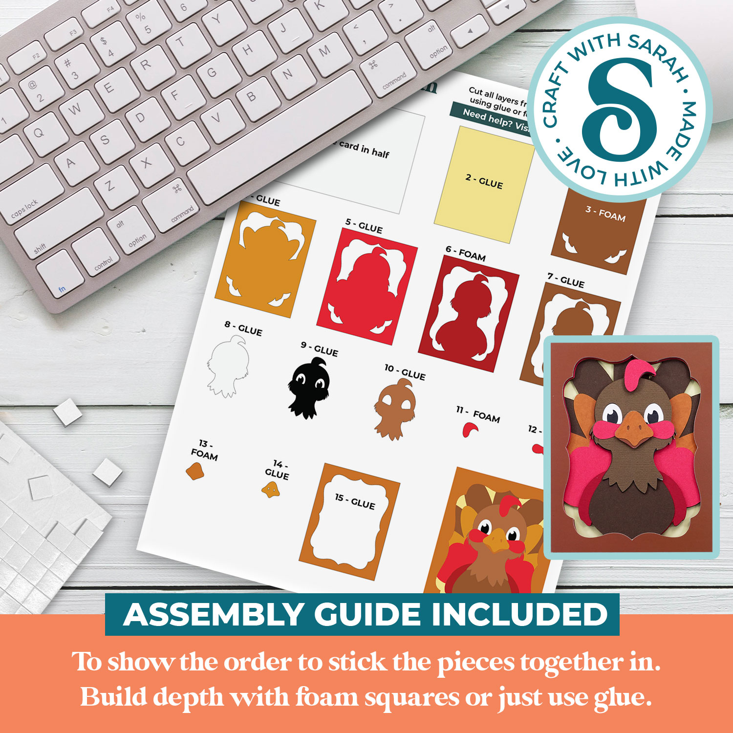 This greetings card comes with an assembly guide that shows the order to stick the pieces together in.
