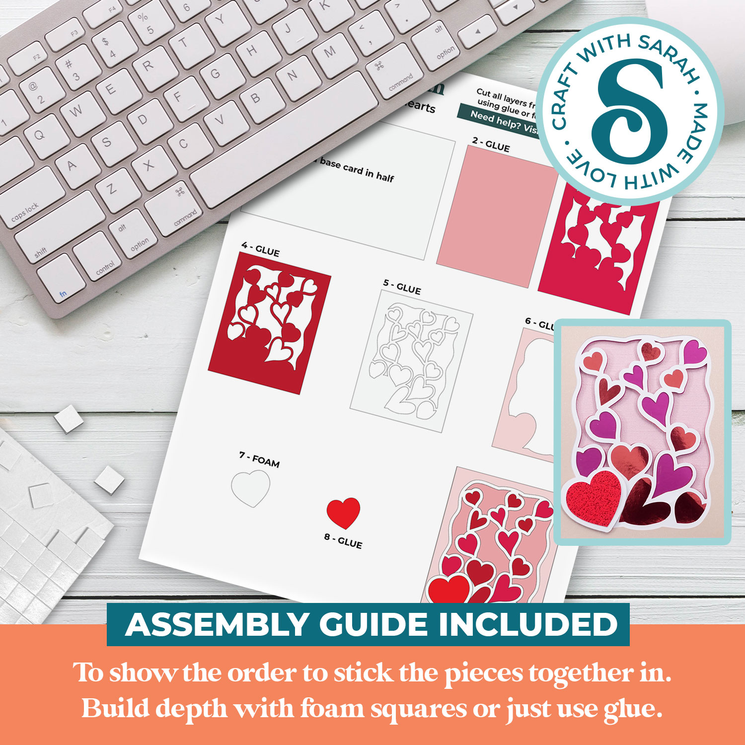 This greetings card comes with an assembly guide that shows the order to stick the pieces together in.