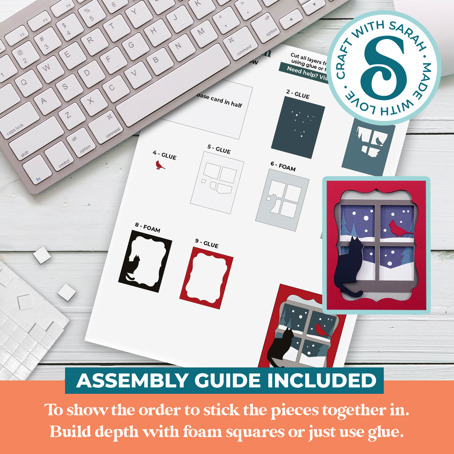 This greetings card comes with an assembly guide that shows the order to stick the pieces together in.