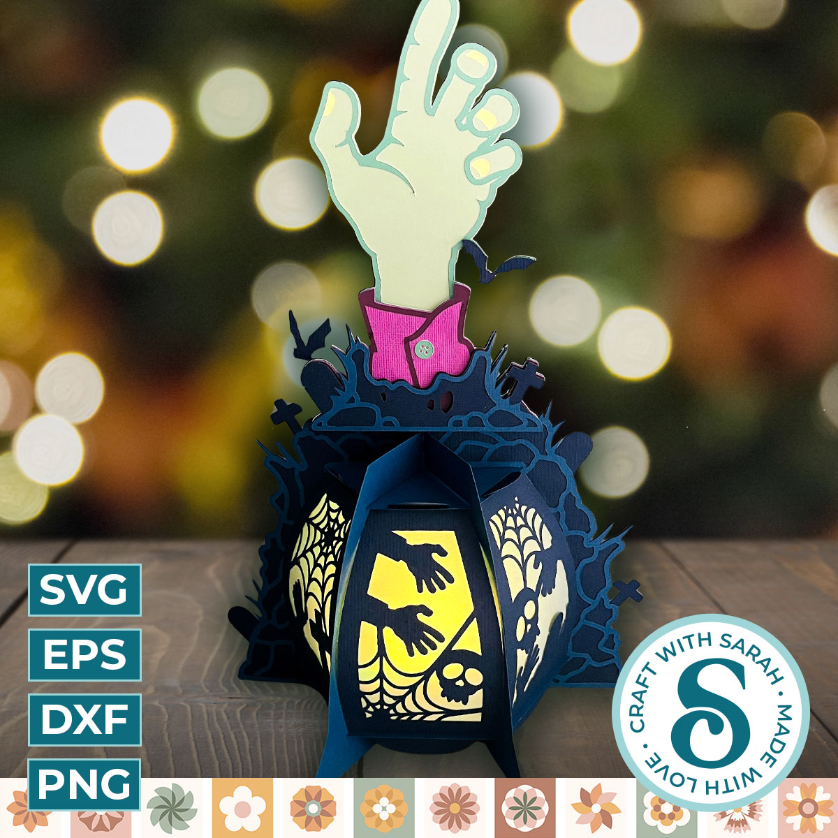 A 3D base lantern with a zombie hand breaking out of the ground as the dead rise for Halloween.